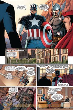 The width of the second panel of “Avengers Mansion” also includes several distant buildings, the front yard, and fence–elements included as if the wide panel shape requires a view of more than the primary subject of the mansion front. The panel is asymmetrical and proportionate.