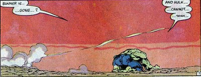 Not only is the subject of the Hulk much smaller than the frame, the frame itself is shaped so that it must include more than the subject. The panel is asymmetrical and expansive.