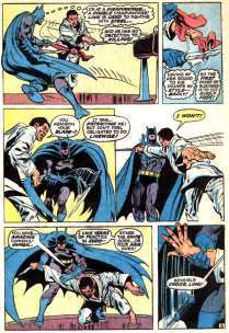 Batman’s leg extends beyond the frame, as if his movement was too fast for the frame to capture. The hand in the final frame also breaks the panel border, again emphasizing action. The panel is asymmetrical and broken.