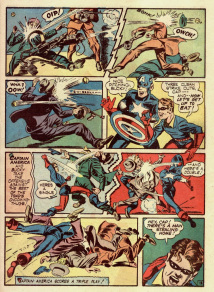 Every panel of the fight scene but the last is symmetrical and broken. The last is symmetrical and off-centered, cutting off Bucky’s chin while leaving space above his head.