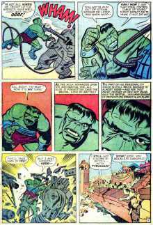 The second row begins with a symmetrical and expansive panel; the second panel is symmetrical and proportionate; and the third symmetrical and abridged. The sequence suggests physical and psychological intensification, but exclusively through framing since the Hulk’s expression remains essentially unchanged.
