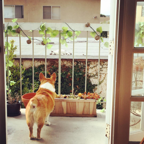 Every day, this cat comes by to lounge on the roof and drive our dogs insane. Give it up, Koa–you’ll never reach him.