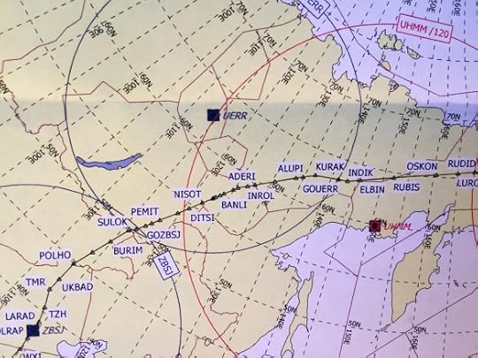 The route to this gem of a city took us over eastern Russia/Siberia and down through Mongolia. Talk about the great white north! What a vast and lonely stretch of this planet northern China is. If you look closely at the next couple of photos you’ll see a town and some roads: