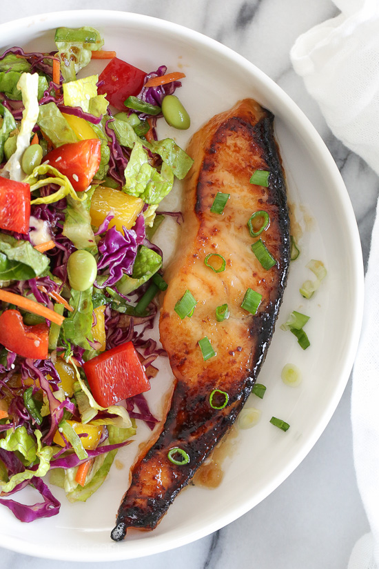 It also happens to be a super easy dinner – marinade it overnight with 3 ingredients, then broil it the next day, it's ready in under 10 minutes! I served this with yesterday's Asian chopped salad but this is also great with rice, quinoa or even cauliflower "fried rice".