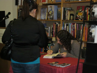 I must have signed 100 books! I only messed up the personalizations and notes a few times, and I used two copper metallic markers up dry. I gave away five Angelfire totes each filled with a signed copy of Angelfire, two more books, an Angelfire shirt, tons of bookmarks, stickers, buttons, glo sticks, SillyBandz.... Wow there were tons of goodies in them! AND! Harper was awesome and sent a bag of goodies to give away too! It included all of the Dark Days of Summer books, and even DIVERGENT and STARCROSSED! I almost stole it and ran, but I was a good author and gave it away.... *pouts* ;-)