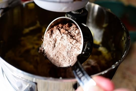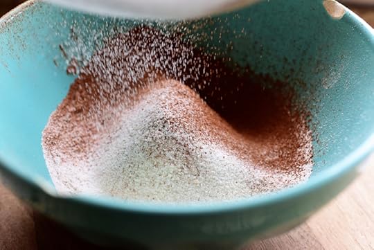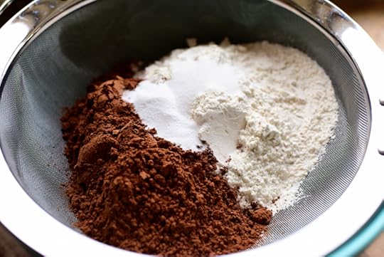 Now, to turn the cookies into chocolate wonders, sift together flour, cocoa powder, baking soda, and salt.