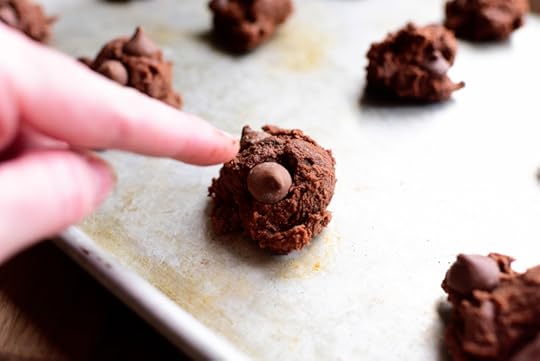 Then I like to press 2 or 3 chocolate chips into the top before they go into the oven. Milk chocolate if you like things sweeter, semi-sweet if you like things more chocolaty, both if you like…well, both!