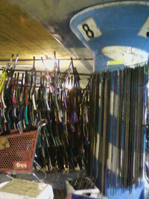 Bike parts are everywhere, most neatly sorted and labeled. Crates of pedals, racks of frames and tires and forks, hanging art of bicycle chains…like this.