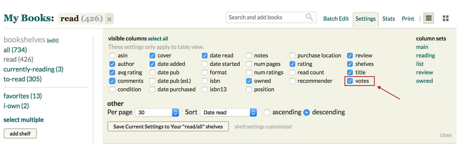 Kaethe wrote: "How do I find out what my most-liked review is? Suddenly I'm dying to know."Kaethe, you can view these by visiting your read shelf (or any other exclusive shelf that you add your reviewed books to) on your My Books page, and then clicking the settings option above your book list. Check the "votes" box to add a column showing how many Likes each of your reviews has received: