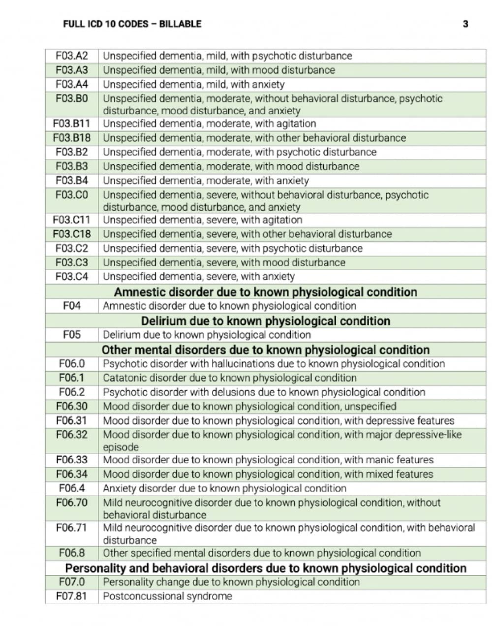 - 28 pages of the full ICD 10 codes for Mental, Behavioral and Neurodevelopmental disorders.