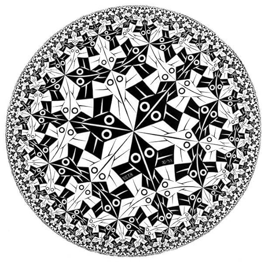 In Penrose's case, it's mathematics and physics: he resolutely refuses to dumb it down, and includes a seriously frightening quantity of Greek letters. If it really were true that every equation halved your sales, he would not have sold a single copy. What saves him, and makes the book readable to non-experts like me who at least have some mathematical background, is his uniquely visual way of experiencing mathematics. Penrose can obviously hack the equations, but he also has to see them, and he is astonishingly resourceful at coming up with visualisations. The ones I liked most had to do with Special Relativity. You may recall this fairly well-known picture by Escher: