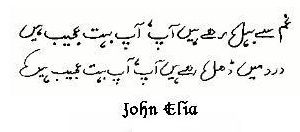 Jaun Elia was a notable Pakistani Urdu poet. He was widely praised for his unique style of writing. He was the brother of renowned journalist and psychoanalyst Rais Amrohvi and journalist and world-renowned philosopher Syed Muhammad Taqi. He was husband of famous columnist Zahida Hina. He was a man of letters, well versed in Arabic, English, Persian, Sanskrit and Hebrew.