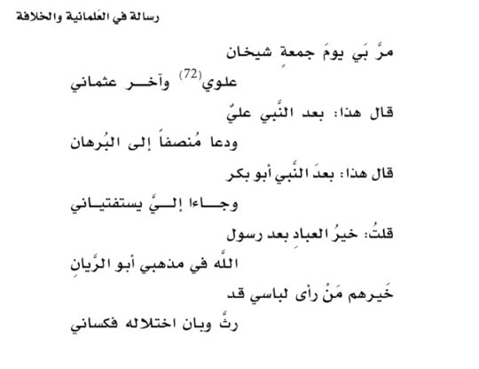 ويتضح هنا الألم والقهر عند الكاتب عندما يقول: وقد نسخوا من القرآن كل توادد وتراحم ومحبة وتسامح ورفعوا منه كل تلك النصوص ويصعب الاتفاق على تلك المجزرة الرهيبة للآيات المقدسة، ومن المعلوم أن كل ما يتعلق بالإجبار والكراهة والقتل هو محدد الزمنية له أسباب نزوله وكل ما يفيد المودة والسلم له صفة الإطلاق والأبدية، ويشير هنا إلى أن الشيعة أدركت أنه لا يمكن قيام دولة دينية إلا بوجود المعصوم ويقصد بالأئمة الإثني عشر وهو وحدهم القادرون على تحقيق العدل الإلهي.