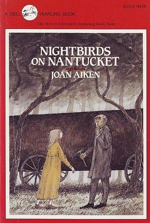 I recently acquired a copy of The Stolen Lake, which is the fourth book in Joan Aiken's "Wolves Chronicles", and it prompted me to check out this book, which is the third in the series, from the library. Nightbirds on Nantucket is totally bonkers, and totally excellent. It opens on a ship at sea in the Arctic; a girl is asleep on deck and we learn she's "been asleep for more than ten months". She wakes, and turns out to be Dido Twite from Blackhearts in Battersea: this ship, a whaling vessel out of Nantucket, picked her up from the water where she'd been clinging to the mast of a wrecked ship and she's been along for the ride with them ever since. The ship Dido's on belongs to Captain Casket, a Quaker whaler who is "funny in one way, awful peculiar": he says he's seen a pink whale, and, moreover, he "forever had this notion that one day he would see one—on account of summat as happened when he was a boy."
