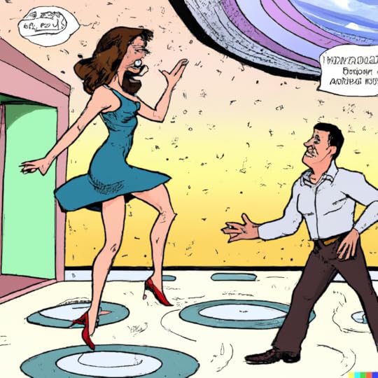 I was curious to see how well DALL-E would succeed at illustrating this scene. Here's what it came up with in response to the prompt "A cartoon in the style of a Marvel comic. A beautiful woman in a tight-fitting dress with a flared skirt is indoors in a room on the Moon. She angrily stamps her foot, causing her to fly half a meter into the air. To one side, we see a man with Hispanic features laughing at her."
