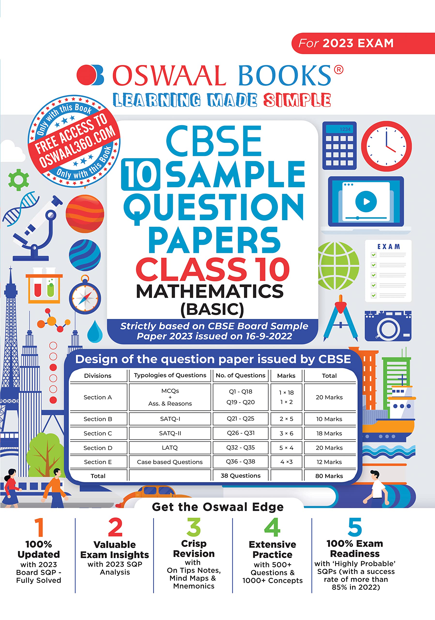 This product covers the • 10 Sample Papers-5 Solved & 5 Self-Assessment Papers strictly designed as per the latest CBSE Sample Paper released on 16th September’2022 • 2023 Board Sample Paper analysis • On-Tips Notes & Revision Notes for Quick Revision • Mind Maps & Mnemonics with 1000+concepts for better learning • 500+Questions for practice
