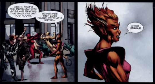 Without doing huge exposition dumps David explains why her pregnancy is moving along so fast, and why her child is desired by some many pantheons. Well paced, a huge plus is that the pregnancy story line is not drawn out forever. At the same time a story point to be resolved is Rahne's religious beliefs and issues revolving around her child.