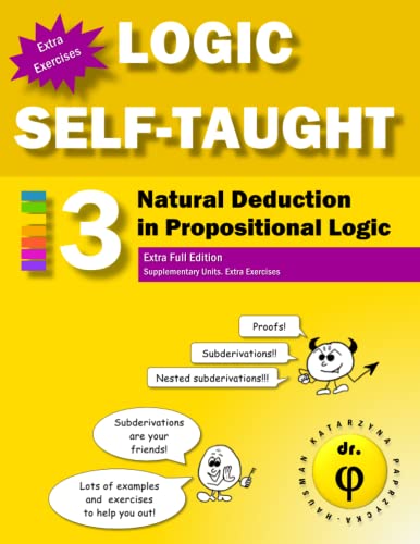 Like personal trainers , the Workbooks offer a practical and empathic approach to introductory logic. They are designed for beginners and for anyone who wants to build confidence by doing more exercises. Workbook 3 (Extra Full Edition) helps you learn how Each inference rule is introduced through numerous exercises : a variety of rule-application exercises, baby-proof exercises, and proof exercises. Their difficulty increases gradually . The point is to train your "logic muscles" until they become strong enough to carry "heavy-weight" content. Visual metaphors help to navigate even multiple subderivations. The study is aided by many examples worked out step by step , warnings of common errors , as well as complete solutions to all exercises. There are five supplementary units (on substitution instances, on complex instances of inference rules, on proofs of tautologies, on additional inference rules, on replacement rules). Additional exercises provide even more opportunity for training. There are two other editions of Workbook 3. The Thin Edition contains no supplementary units and no additional exercises. The Full Edition has the supplementary units but no additional exercises. Individual units of Workbook 3 (Extra Full Edition) are available as Logic Self-Taught Workbooklets (3.1, 3.2, etc.). Logic Self-Taught Workbooks are based on the insight that understanding logic is not sufficient for learning logic, just as understanding how to swim is not sufficient for learning to swim and understanding the grammar of a foreign language is not sufficient for learning the language . You need to practice and take an active part in self-teaching . Through systematic work with the Workbooks, you will build self-confidence . You can learn logic, even its hardest parts. ( Previously published as Natural Deduction in Propositional Workbook 3 Extra Full Edition by Dr. Phi. )