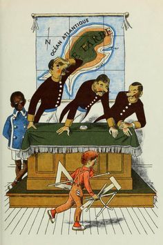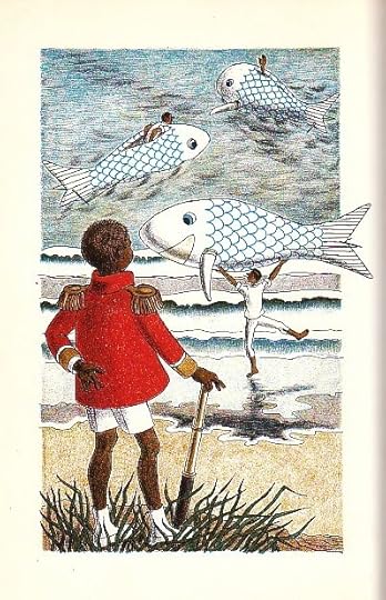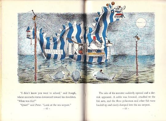 This is a racially progressive story - Bottsford is black, and the three policemen (and, it seems, everyone else) are white. This is never alluded to in William Pene du Bois's text, but only in his fantastic illustrations. Fantastic in both senses - lovely, and full of fantasy. It was first published in 1938. I read the 1960 edition, so I don't know if the two editions had the same illustrations.