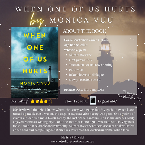 ⭐️3.5 Stars⭐️ I found When One of Us Hurts by Monica Vuu to be extremely dark and some aspects of the story on the point of morbid and I don’t know how I feel after reading it. It has an almost gothic feel about it and is set in Port Brighton, a small town with a population of about three hundred in Tasmania.