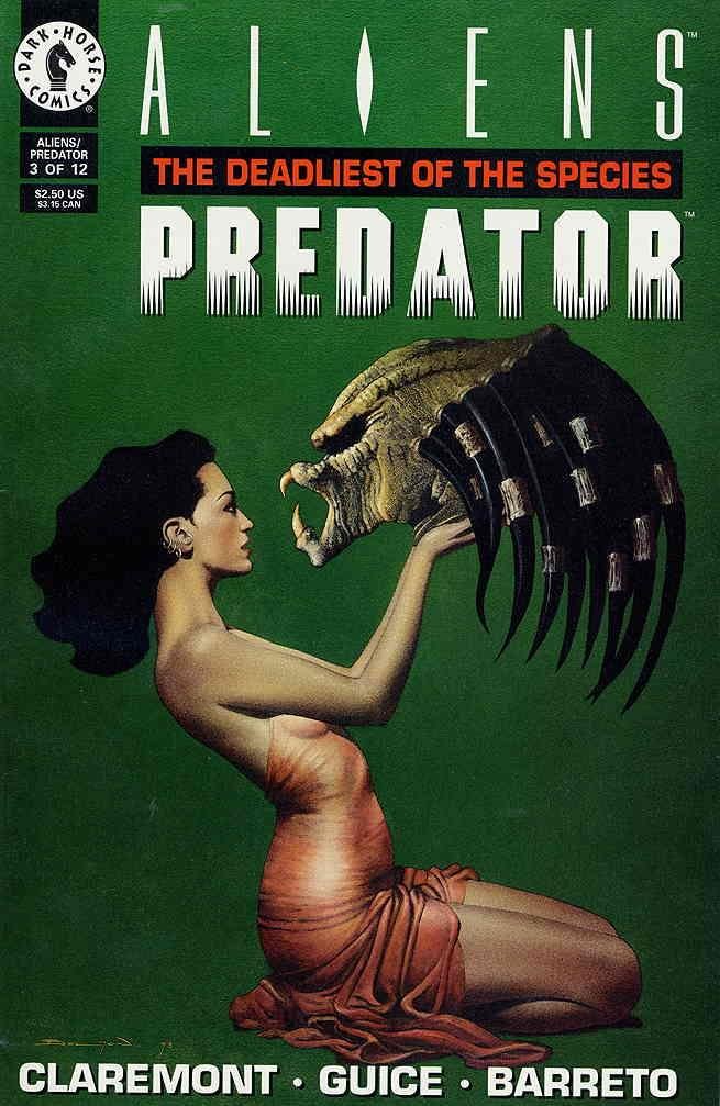 Apparently, Claremont was given huge creative freedom when writing this miniseries... and perhaps he shouldn't have been. This book sort of throws everything at the wall and very little of it sticks. There are huge sections that don't make a lot of sense and end up having very little to do with the actual plot. The worst of these are the scenes where the human soldiers LARP as Predators, get stabbed by a real Predator, have to go into healing tanks and then do it all over again... for... reasons? A close second is where the Alien Queen dribbles all over Caryn and now suddenly Caryn has a skin-tight coating of glowing yellow armour. No, that really does happen.