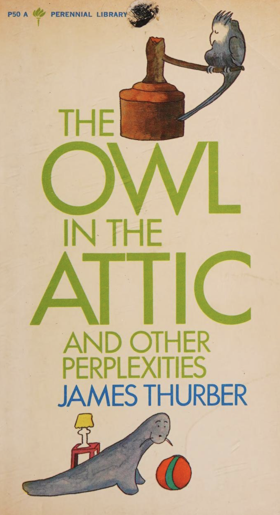 This is of course, a lot more amusing if you can visualize a Thurber sketch of a seal gazing sadly at a ball in the accompanying illustration. The pet department, is alas, much the shortest part of the book. I disliked the cynical not very pleasant stories about Mr. and Mrs. Monroe in the first section, and was bored by the spoofs of Fowler's English Usage that make up the third.
