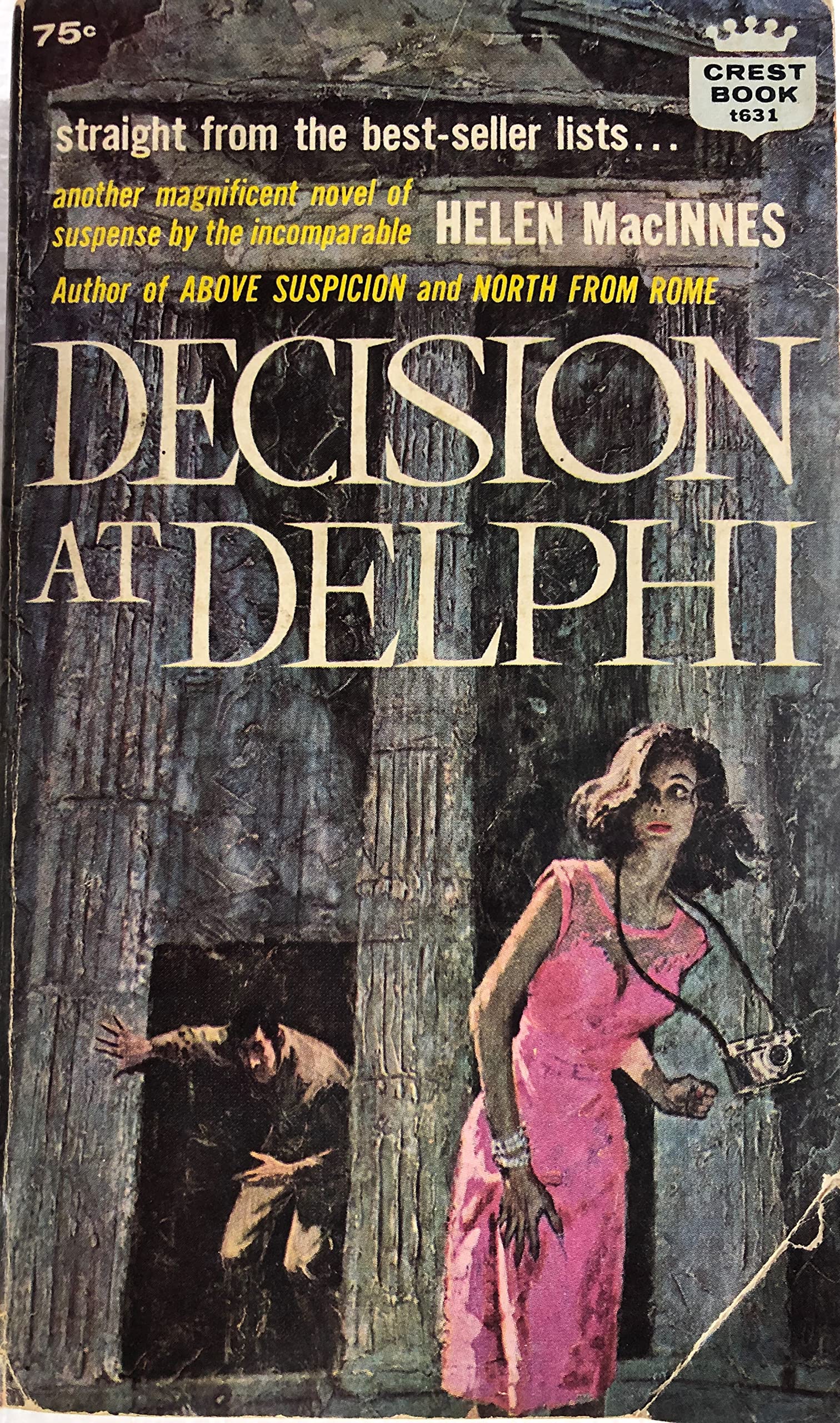 Decision at Delphi (1960) is a gripping espionage thriller with believable characters. Strang served in WWII, so it isn't unexpected that he can handle himself in tight situations. Every character we meet has an interesting backstory that works into the present and MacInnes provides the motives and philosophies of the different factions without making the reader feel like they've sat through a Cold War lecture. There are many historical details necessary to understand the setting and events in late-1950s Greece and MacInnes provides them in a way that keeps the story moving. She also keeps the tension up--making it clear that Strang may well be trusting some of the wrong people, but it is difficult to tell where true loyalties lie is some cases.