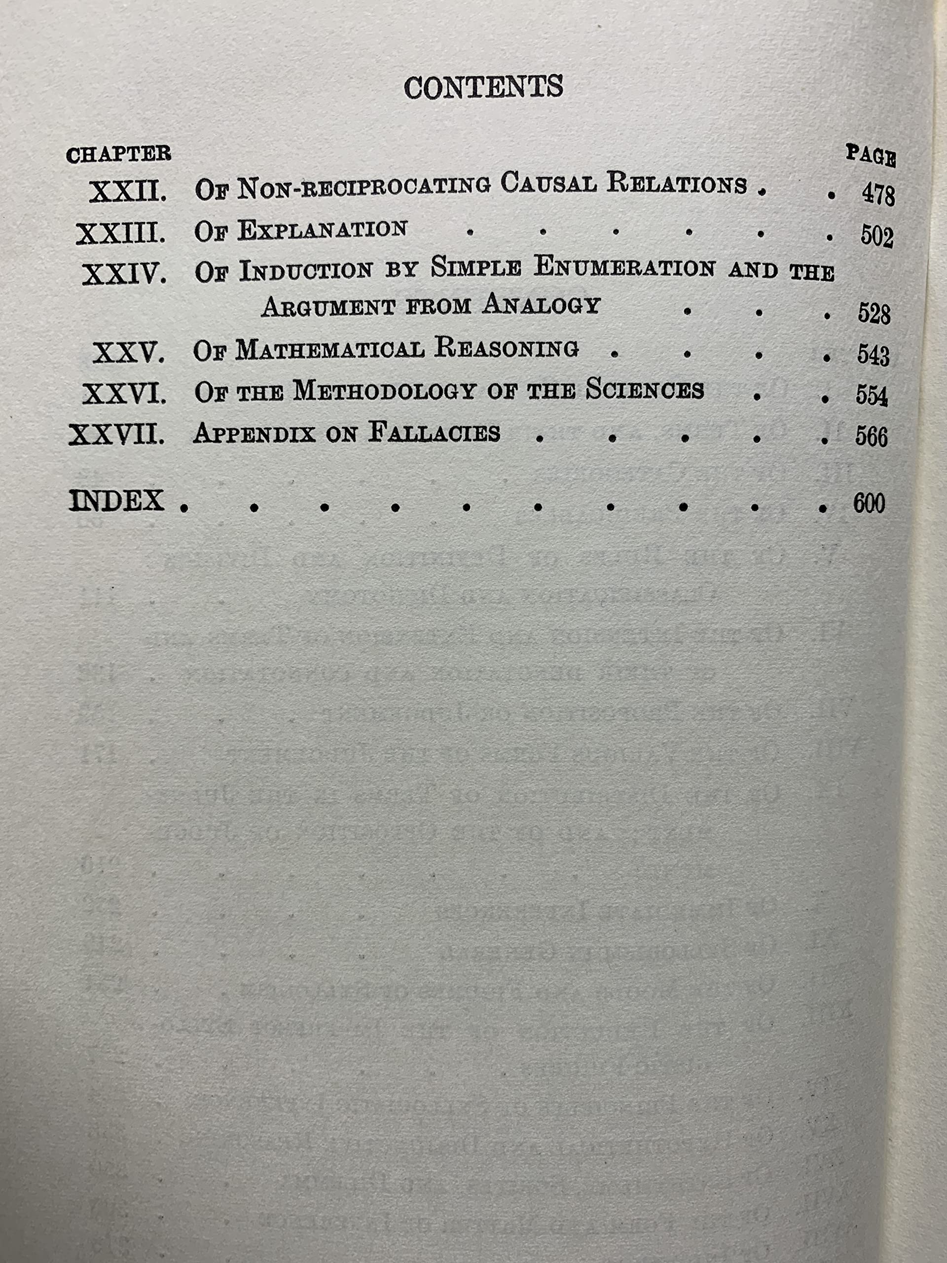 General character of the enquiry Of terms, and their principal distinctions Of the categories Of the predicables Of the Rules of Definition and division Of the intension and extension o terms Of the proposition or judgement Of the various forms of the judgement Of the distribution of terms in the judgement Of immediate inferences Of syllogism in general Of the moods and figures of Syllogism Of the reduction of the imperfect syllogistic figures Of the principles of syllogistic inference Of hypothetical and disjunctive reasoning Of enthymeme, sorites, and dilemma Of the form and matter of inference Of induction Of the presuppositions of inductive reasoning Of the rules by which to Judge of causes and effects Of non-reciprocating causal relations Of explanation Of induction by simple enumeration Of mathematical reasoning Of the methodology