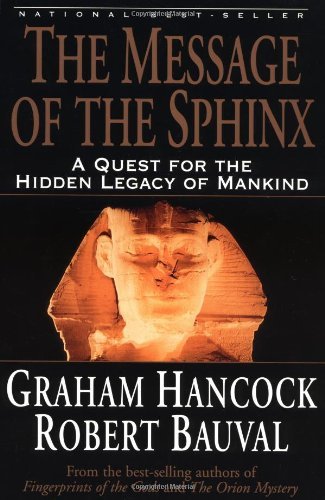 The Message of the Sphinx (aka "Keeper of Genesis" in the UK) is by Graham Hancock & Robert Bauval. Using astronomical data, they claim the creation of the Sphinx & Pyramids dates back to 10,500 BCE. Working from a premise that the Giza complex encodes a message, they begin with recently discovered geological evidence indicating deep erosion patterns on the Sphinx' flanks were caused by 1000 years of heavy rain. Such conditions last existed at the end of the ice age, 10-9000 BCE, meaning the Sphinx may be over 12,000 years old, not the generally accepted 4500. Using computer simulations, they suggest the pyramids, representing the three stars of Orion's Belt, along with associated causeways & alignments, constitute a stone record of the celestial array at the 10,500 BCE vernal equinox. This moment represents Zep Tepi, the "1st Time," often referred to in hieroglyphic records. They claim initiation rituals of Egyptian pharaohs replicate on Earth the sun's journey thru the stars in this remote era. They suggest a lost civilization's "Hall of Records" may be located by treating the Giza Plateau as a template of these ancient skies. Professional archeologists dismiss this theory as there's no other evidence for such an ancient civilization's existence.