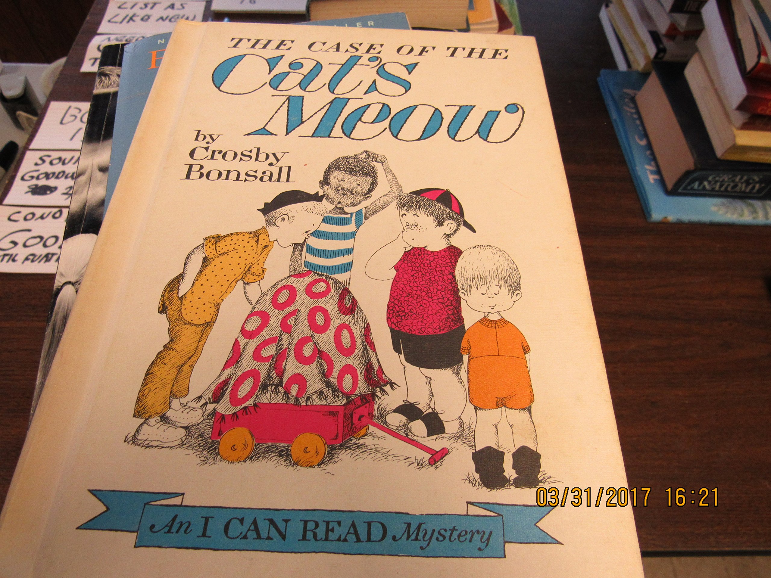 The detail I recalled, other than a heart-warming outcome out of place with the main tone; is that the youngest kid was annoying! To find his name is ‘Snitch’ and to see his surly depiction again, with the frequent remark that he yells and bawls; lessens my regard now that I am grown up. I think he’s one of those characters that would permit greater enjoyment of a story by being absent. One redeeming virtue is his cat, Mildred, whom he expressively loves. The mild mystery that’s just right for the neat clubhouse in the backyard, something I had myself for a time, is that Mildred appears to have been gone for two days. She has a kitty door and the four boys noticed that she did return for food. After camping in the yard two nights, the detectives hear the titular ‘meow’ and follow ‘Mildred’, where they’re surprised by the mystery’s revelation.