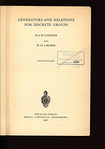 When we began to consider the scope of this book, we envisaged a catalogue supplying at least one abstract definition for any finitely­ generated group that the reader might propose. But we soon realized that more or less arbitrary restrictions are necessary, because interesting groups are so numerous. For permutation groups of degree 8 or less (i.e.' .subgroups of es), the reader cannot do better than consult the tables of JosEPHINE BuRNS (1915), while keeping an eye open for misprints. Our own tables (on pages 134-142) deal with groups of low order, finite and infinite groups of congruent transformations, symmetric and alternating groups, linear fractional groups, and groups generated by reflections in real Euclidean space of any number of dimensions. The best substitute for a more extensive catalogue is the description (in Chapter 2) of a method whereby the reader can easily work out his own abstract definition for almost any given finite group. This method is sufficiently mechanical for the use of an electronic computer.
