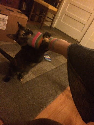 Chloe: A game to see how long it takes me to get her to put it down and give me chin scratches?