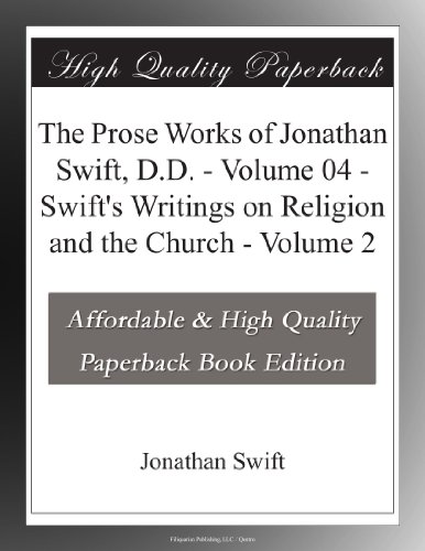 The Prose Works of Jonathan Swift, D.D. - Volume 04 - Swift's Writings on Religion and the Church - Volume 2 is presented here in a high quality paperback edition. This popular classic work by Jonathan Swift is in the English language, and may not include graphics or images from the original edition. If you enjoy the works of Jonathan Swift then we highly recommend this publication for your book collection.