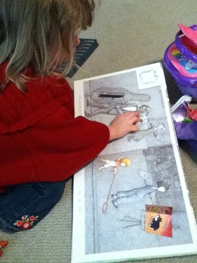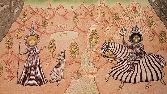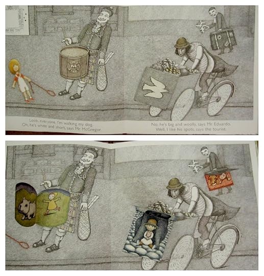 The endless possibilities of imagination come alive in Sis' works, as Madlenka and her imaginary dog meet up with her friend Cleopatra and her imaginary horse and run into the courtyard to play. The imaginary worlds they play in have small holes cut into each page that allow the face of Madlenka and Cleopatra to show on each page.![]()