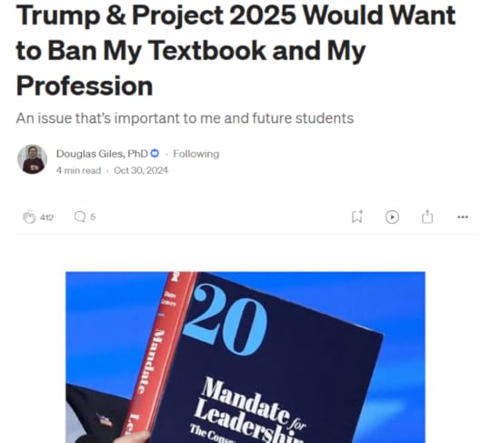 This is the Project 2025 you’ve been hearing so much about. I read this from a giant 922 page pdf I downloaded. If you search “Mandate for Leadership” it is not terribly hard to find. Much of it reads as boring policy-wonk navel-gazing, but if you really stop to think of the consequences of even the boring bits, it’s quite terrifying. Apart from being a blueprint to usher in authoritarianism, the outcome of these policies would be absolutely devastating for our economy. The wish to dismantle all regulatory agencies would leave almost every facet of our lives in jeopardy of lacking safety precautions. Food supply, energy, medical resources, everything. There is very little any truly principled conservative would agree with in this plan. It is meant to elevate the very wealthy to a Soviet-style oligarchy ruling class while erasing the personal autonomy of the middle class and working poor. I’d encourage anyone concerned about how democracies in decline tip over into authoritarian/fascist regimes to seek out the work of Ruth Ben-Ghiat or Anne Applebaum. You can even search for podcasts featuring them if you’d like a shorter tutorial on the subject. We are in dangerous times given the outline presented in this Mandate.