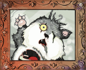 SO Tiddles the cat is a huge feline whore with all the female felines. He goes and gets a snack but gets bitten by his snack, a mouse. Tiddles now becomes Zombie Cat, or ZC. He starts falling apart in a nasty manner, losing his eye, his good legs, his insides hanging out, and all this time he starts to crave braaiiiiiiins. YUM! This is how he looks as he heads home to find his master.