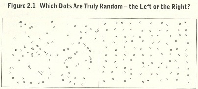 Si le pidiéramos a una persona que distribuyera aleatoriamente puntos sobre una hoja de papel, probablemente todos estarían bastante espaciados e intentarían rellenar todo el folio (a la derecha). Pero el verdadero azar hace que siempre aparezcan conglomerados de puntos (a la izquierda) que llaman la atención y hacen que parezca que “algo” concentra los puntos en una zona concreta. No es así. Es el azar.