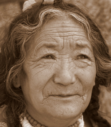 Faces of a Navajo and a Tibetan woman. Similarities in appearance possibly reflect a common ancestor who crossed the Bering land or ice bridge between continents from Asia during cycles of the ice ages.