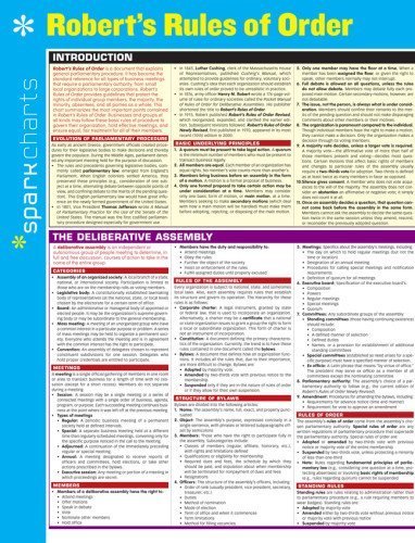 SparkChartsTM—created by Harvard students for students everywhere—serve as study companions and reference tools that cover a wide range of college and graduate school subjects, including Business, Computer Programming, Medicine, Law, Foreign Language, Humanities, and Science. Titles like How to Study, Microsoft Word for Windows, Microsoft Powerpoint for Windows, and HTML give you what it takes to find success in school and beyond. Outlines and summaries cover key points, while diagrams and tables make difficult concepts easier to digest. This six-page chart Introduction to parliamentary procedureThe deliberative assemblyMotionsOfficersMinutes and standard order of businessCommitteesBoardsMass meetingsConventionsAmending bylawsDisciplinary proceedingsGlossary of terms