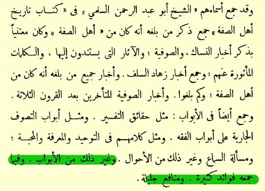 "طبقات الصوفية للسلمي ويليه ذكر النسوة المتعبدات الصوفيات" كتاب جمع فيه صاحبه تراجم متأخري الصوفية من الرجال على خمس طبقات كل طبقة يذكر فيها عشرين شيخا، ثم من النساء، فيذكر بعضا من أحوالهم مع جمعه أشهر أقوالهم. أقدم خمس نجوم للكتاب ولست أوفي ... اذ يعتبر هذا المصنف بخلاف طابعه في الجمع وما يضيفه للموروث الصوفي، دعوة لإصلاح القلوب وللنظر في علاقتك بالله ، دعوة لتصحيح العبادات والعمل على خلوها من باطن الإثم .. فمن نظر فيه فليضعه موضع القرب من قلبه ولينظر نظر الفاحص، المتأمل، المعتبر وسيرى تغير حاله بعد قراءته. هذا وإنه بما أحاطه من حال مشايخ الصوفية وجلتهم قد كشف عن الوجه المشرق للتصوف ، لا الذي كدر بالمحرمات والبدع بما ينسبون اليه، ولا الذي عرف اليوم من خلال أثر الثقافات الأجنبية حتى صار "أحلاما للصبيان" وانما هو التصوف الحق نسمع فيه صوت الجنيد رحمه الله يردد : "الطرق كلها مسدودة على الخلق إلا من اقتفى أثر الرسول صلى الله عليه وسلم، واتبع سنته، ولزم طريقته، فإن طرق الخيرات كلها مفتوحة عليه". وقول سهل بن عبدالله التستري : "أصولنا سَبْعَة أَشْيَاء التَّمَسُّك بِكِتَاب الله تَعَالَى والاقتداء بِسنة رَسُوله صلى الله عَلَيْهِ وَسلم وَأكل الْحَلَال وكف الْأَذَى وَاجْتنَاب الآثام وَالتَّوْبَة وَأَدَاء الْحُقُوق" .