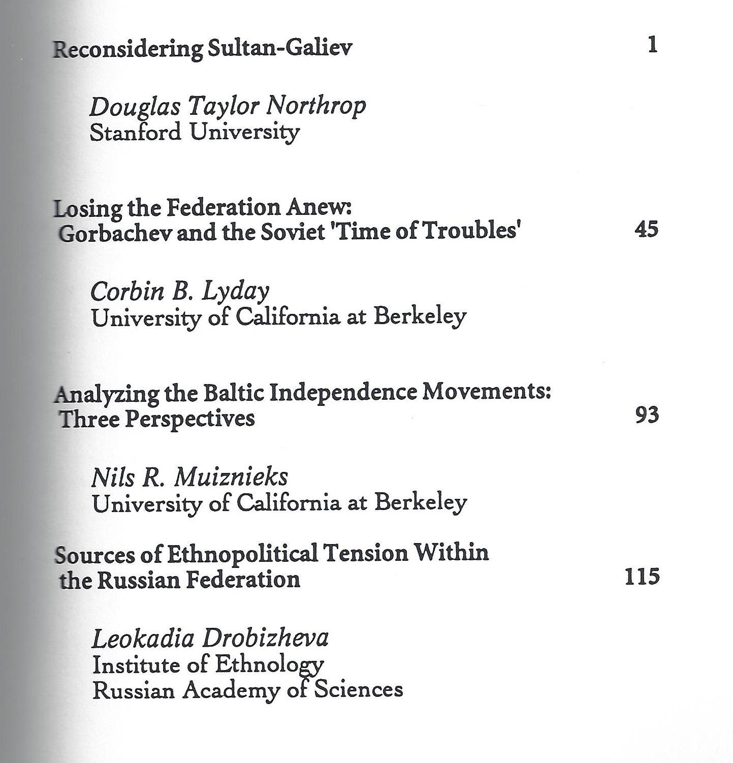 Selected Topics in Soviet Ethnopolitics : Reconsidering Sultan-Galiev; Gorbachev & the Soviet Time of Troubles; Analyzing the Baltic Independence Movements: Three Perspectives; Scources of Ethnopolitcal Tension Within the Russian Fedration