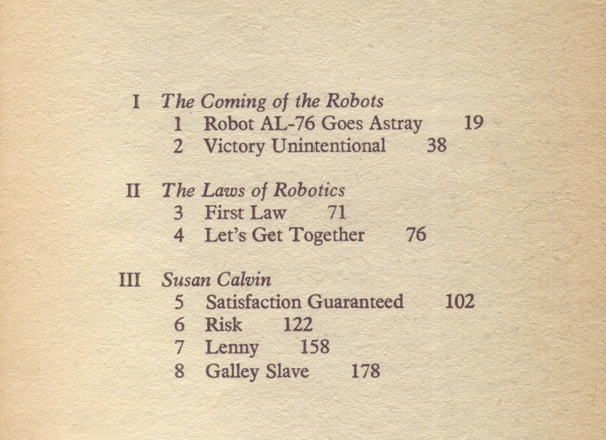 Leuk tussendoortje. SF die ondertussen enorm gedateerd is (de meeste verhalen werden in de jaren 1950 geschreven): roken is nog schering en inslag, computers worden nog met ponskaarten geprogrammeerd, vrouwen komen nauwelijks aan bod (behalve dr. Susan Calvin, die als een koel beredeneerde wetenschapper wordt afgeschilderd) en robots zijn vandaag de dag ondertussen overal in alle vormen (behalve misschien de humanoïde versies) ingeburgerd.