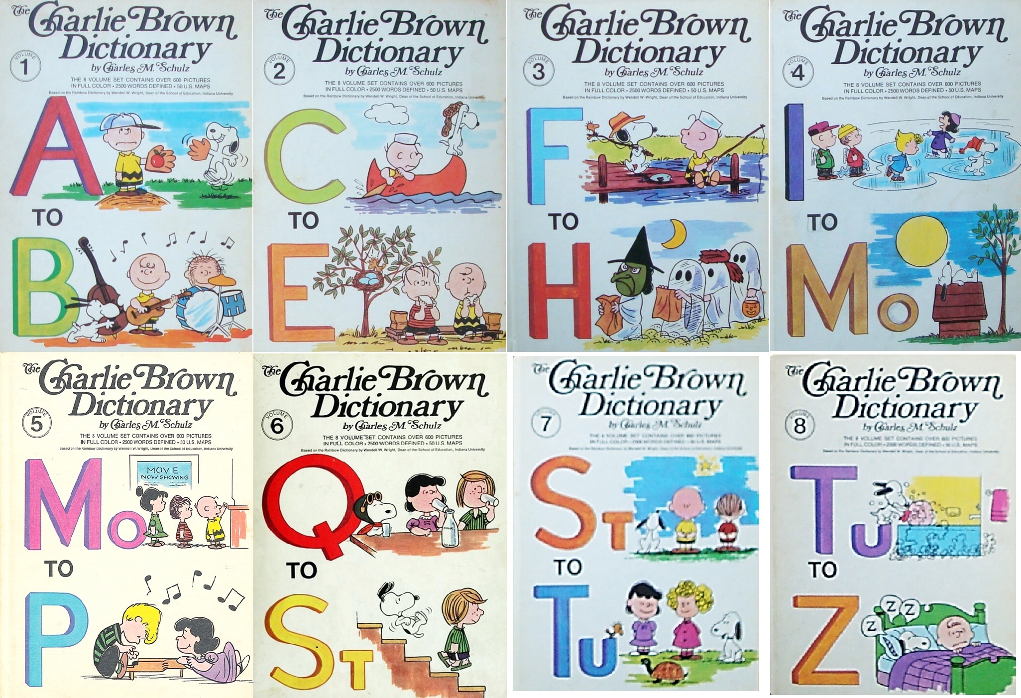 Charlie Brown himself, Snoopy wearing his dish as a hat, Linus with his security blanket, Lucy giving advice, all help to motivate children to learn about the hundreds of words defined in these volumes.