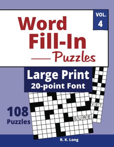 Starter word included for all crossword puzzle grids within this Volume 4 of Word Fill Ins. Easy to read and write on, printed 1 (one) puzzle per page , on quality 8-1/2x11-inch paper, in Extra Large size 20-point font type for word lists and puzzles. If you need some help, you can always look at the Solutions in the back of this Large Print Crossword-style Word Fill In Puzzle Book.