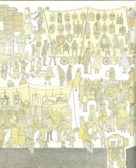 This book has two pages of text, a prologue explaining what flea markets are, and an epilogue in which Anno writes about an old wooden bowl he bought at a flea market, and how old, handmade things are better than new, mass produced imitations. The rest is Anno's wordless illustrations, which look to be ink, watercolor, and gouache and are fabulous. They feature an enormous castle, half-timbered buildings, horsedrawn carts, old automobiles, furniture, and tables loaded with old typewriters, cameras, clothes, tools, pots and pans, vegetables, dolls, etc. The pages are cluttered (in a good way) in the manner of a Richard Scarry book.