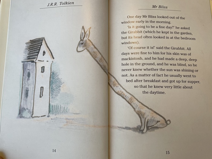 Tolkien's short books are bonkers. Like... there's a guy...and he lives in a tall house and wears tall hats. And he has a girabbit. Which is essentially a rabbit with a neck the length of a giraffe. Mr. Bliss finds out at the end of the book he's supposed to have a permit for the girabbit, by the way, and owes a pretty penny. One day Mr. Bliss wakes up and decides he wants to buy a yellow motorcar that also is yellow on the inside with red tires on the outside. Naturally. So he sets out to buy a yellow car and meets a lady with bananas and a guy with cabbages and three talking bears. Pandemonium ensues.