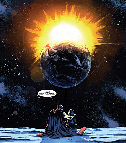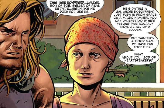 But the highlight was visiting his ex, Jane Foster, who’s with someone else – a non-superhero man – and is going through cancer treatment. Aaron effortlessly writes their scenes so well that within a single panel you instantly believe their years of history, and Jane gets some great lines that make me wish Aaron were scripting the Thor movies.