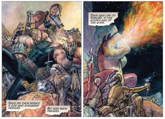 The second visits the young Thor of long ago, who spends his time alternately drunk, covered with vomit and making friends with a shark/dragon creature.