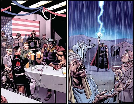 To make things worse, "The Accursed" contains dangerously naïve overtones of America’s recent military operations. We are introduced to a society of so-called dark elves who are portrayed as notoriously incapable of self-rule, and who are thus in desperate need of Thor's divine intervention. When this intervention - due to the dark elves' "unteachable nature" - does not show the desired results, Thor nevertheless receives reassurance that he has done the right thing for all the right reasons: “You saved lives, Thunder God. Do not doubt that. You ended the bloodshed... If there is ever a lasting peace made between the realms, they may say that it began here, with us. With you.” It is the kind of fictional justification for hawkish militarism gone haywire you'd expect from Disney but not from Jason Aaron.