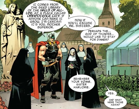 Luckily, there's more to the book than that. The volume starts with a sort of day-in-the-life of Thor. Which, for him, includes things like bringing a rare gift to a condemned man, offers aid to nuns, and generally does the sort of thing that you'd expect an actual, literal god like Thor who really answers prayers to do. And then he visits Jane Foster. This is one of the best scenes in the book, with Jane and Thor as exes who still like, respect, and genuinely love each other, despite having put their romance in the past.